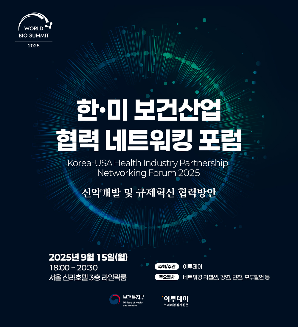 이투데이는 올해 창간 15주년을 기념해 ‘2025 세계 바이오 서밋’ 부대행사로 국내외 보건산업계 관계자들을 모시고 양국 보건산업 협력 증진과 글로벌 의약품 공급망 협력 강화 방안을 논의하는 ‘한·미 보건산업 협력 네트워킹 포럼’을 마련했습니다. 이투데이는 이번 포럼을 통해 국내·외 보건산업 전문가 및 기업 간 교류·협력 방안을 제시하고자 합니다.