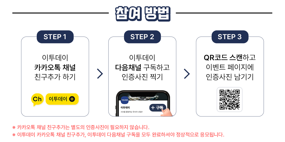 ▸ 경품 스타벅스 아메리카노T 기프티콘 1매 (100명 추첨) ▸ 이벤트 기간 1/28(수)~3/3(화) ▸ 당첨자 발표 3/10(화) *경품은 당첨자 발표 일주일 이내에 개별 발송됩니다. ▸ 주의사항 안내 • 이투데이 다음채널 구독, 이투데이 카카오톡 채널 추가를 모두 완료하셔야 정상적으로 응모됩니다. • 경품은 정상 참여자에 한해 지급되며 비정상 참여시 당첨에서 제외됩니다. • 이벤트 기간 내 다음채널 구독, 카카오톡 채널 추가 해제 시 당첨에서 제외됩니다. • 입력한 정보에 오류가 있을 경우 경품 지급이 어려울 수 있으며, 재발송은 불가합니다. • 이벤트는 1인 1회 참여 가능하며 중복 참여 시 당첨이 제한될 수 있습니다. • 경품 발송 일정은 당사 사정에 의해 지연될 수 있습니다. • 수집된 개인정보는 경품 발송에만 활용되며, 발송 후 완전히 폐기됩니다.